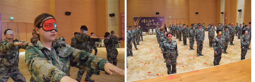 【活動介紹:心靈馬拉松】所有參訓學員以小組為單位圍成一個肩并肩面向圓心的圓。 所有人用眼罩蒙著雙眼,在自己和同伴的吶喊聲中,在體驗 的身體極限,通過扎馬步,挑戰自我!通過這個項目學員可 以體會到自己本